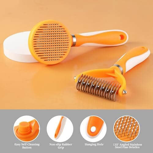 1. Dual-Sided Design for Complete Grooming: Our first dog brush for shedding features a unique dual-sided design crafted with stainless steel teeth. The 9-teeth side effortlessly tackles stubborn mats and tangles, making grooming easier and more comfortable for your pet. Flip to the 17-teeth side to gently thin out and deshed your pet's fur, reducing shedding and keeping your pet's coat healthy and vibrant.It is a perfect undercoat rake for dogs and cats.